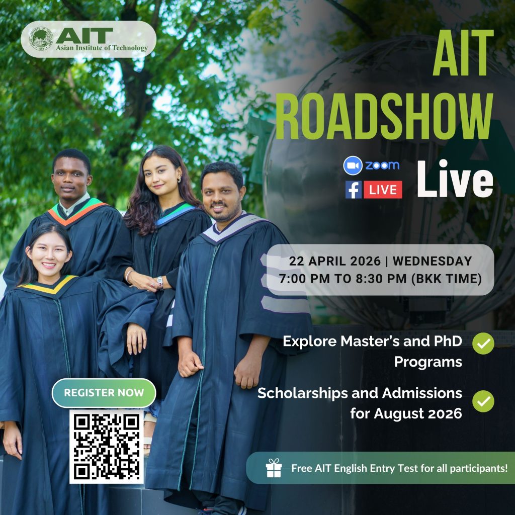 Thinking about pursuing your Master’s or PhD at AIT? Join our online roadshow to explore academic programs, scholarships, admissions, and student life directly with our deans, faculty, students, and admissions team.